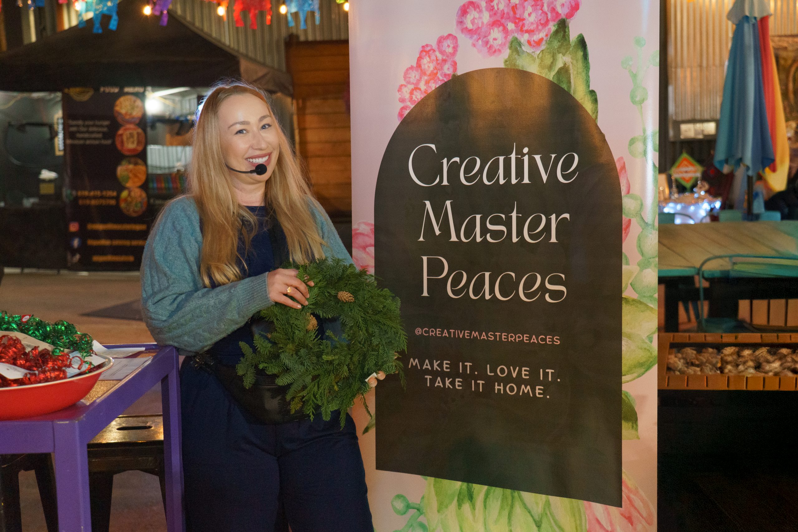 The event was elevated by our incredible activity and experience partners, who brought movement, art, and energy throughout the night. This included a Wreath Creation Station by Creative Master Peaces, live music curated by DJ Betty Bangs, a Bachata dance lesson by Tetyana, a line dancing lesson by Verenice, and live art by Lady Priscilla Bree. Guests also enjoyed tacos catered by Miguelito’s Catering Services, adding to the festive atmosphere.